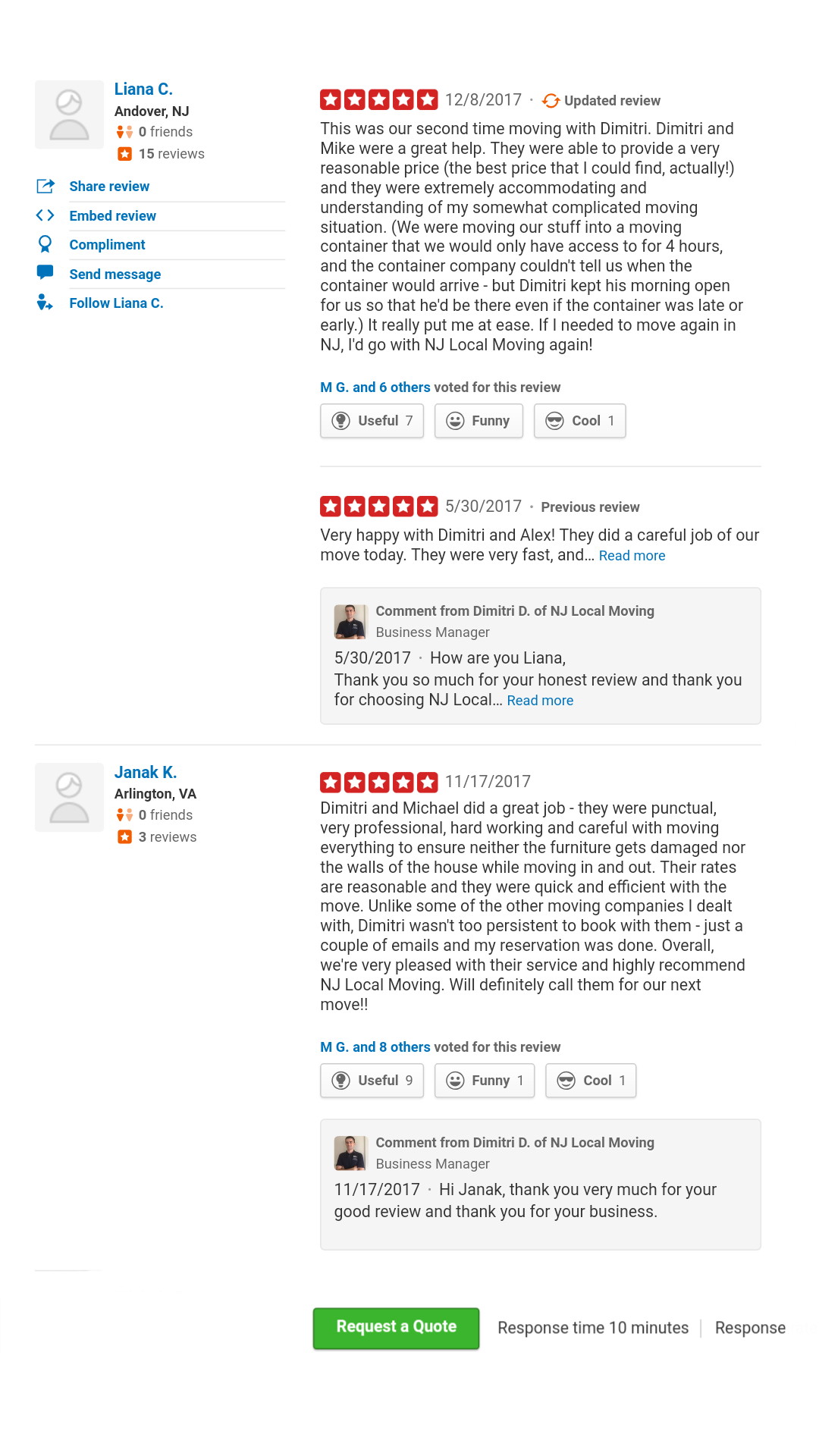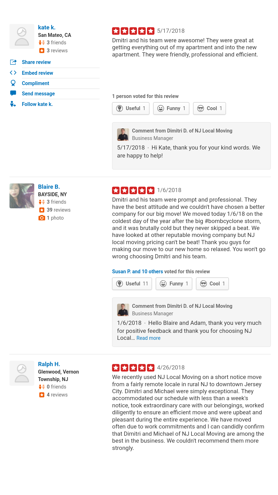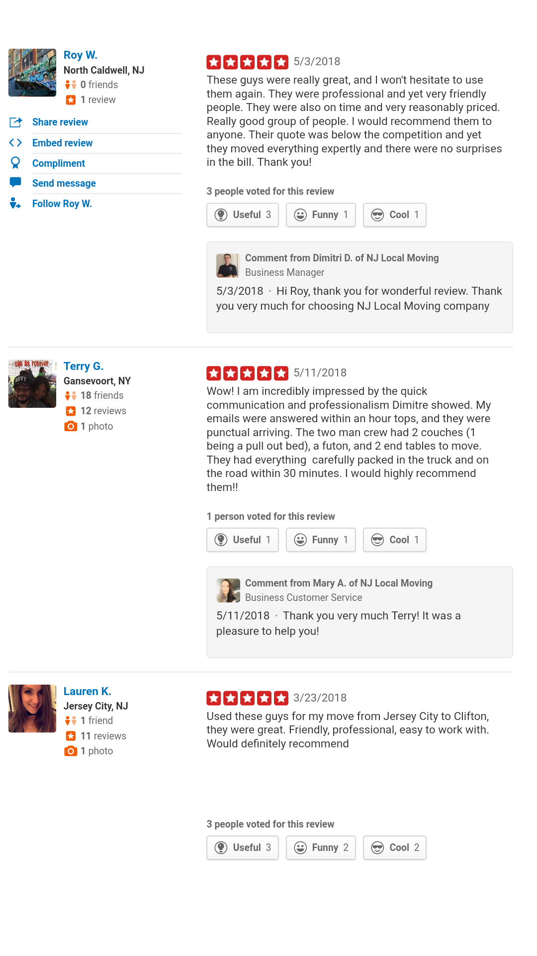 A lot of companies claim to be the best in their field, but few can back that claim up with consistent reviews. No matter where you look, NJ Local Moving has built a reputation for consistently providing 5-star or "A" rated service to our clients. Check out our Moving Reviews and Experiences to see for yourself that we are expert movers!